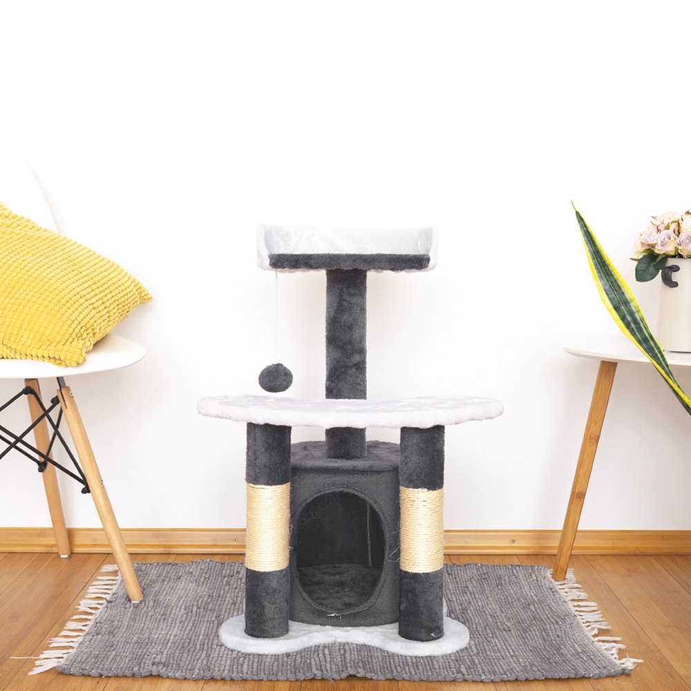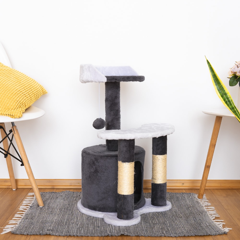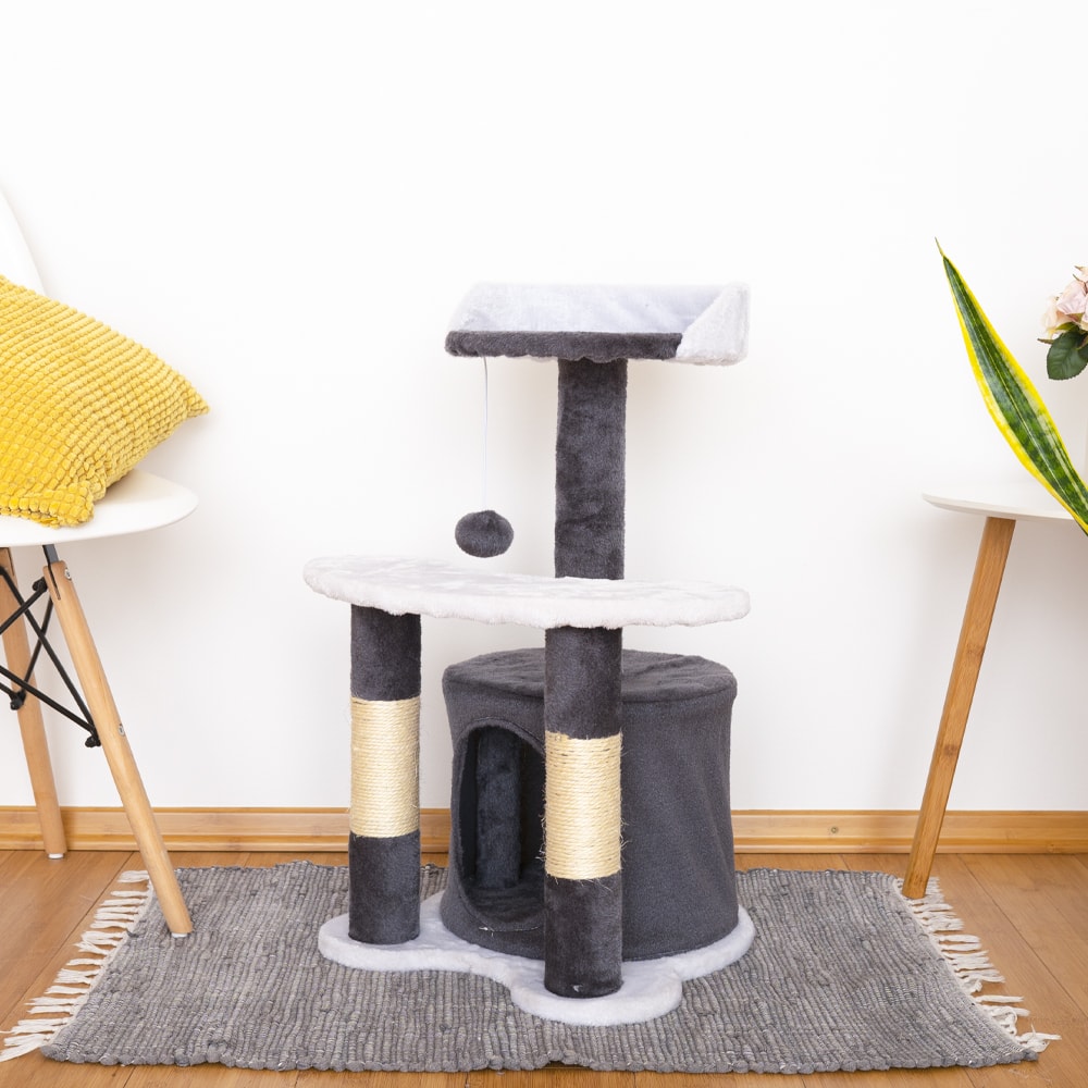 Trdno in stabilno ohišje, previto v mehak pliš bo vašemu štirinožnemu prijatelju služil kot skrivališče in prostor za igranje. V Spodnjem deli drevesa se nahaja hiška, namenjana releksaciji in spanju. Na višjem delu se bo zamotil z visečo kuglico, čisto zgoraj pa bo nadzaroval območje. Vse v enem! Ne smemo pozabiti, da si bo krempeljčke nabrusil na vrvi iz sisala, vaše pohištvo pa bo ostalo nedotaknjeno.