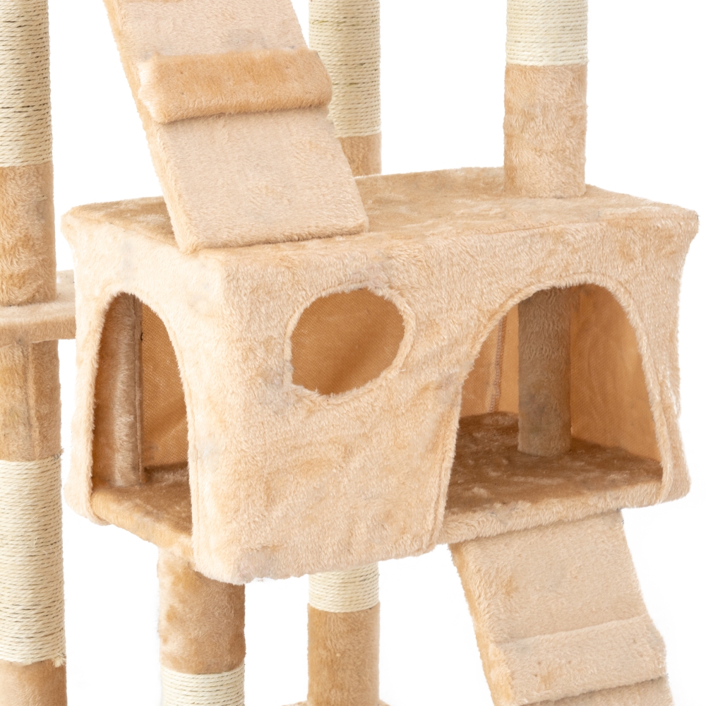 Na mačjem drevesu sta dve hiški, ki služita mačku kot skrivališče, v katerih se nahaja ležišče, kjer se lahko naspi in spočije.